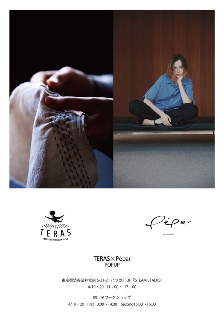 POPUPの2日間では、Péper の生地開発や製品作成時に出た残布にTERASの職人さんが刺し子を施したハギレを使用し、オリジナルのサコッシュを作り上げるワークショップを開催いたします。また4/19にはTERASの職人さんが来場し、実演を予定しております。伝統技術を学びながら、手仕事の魅力を体験できる貴重な機会です。ぜひご参加ください。